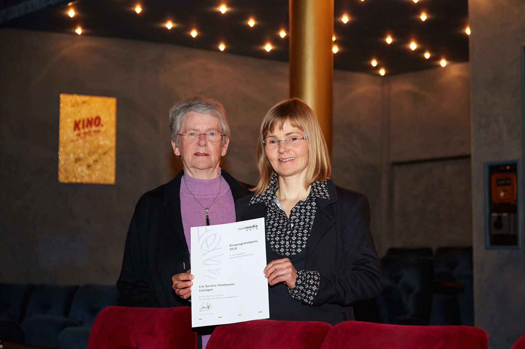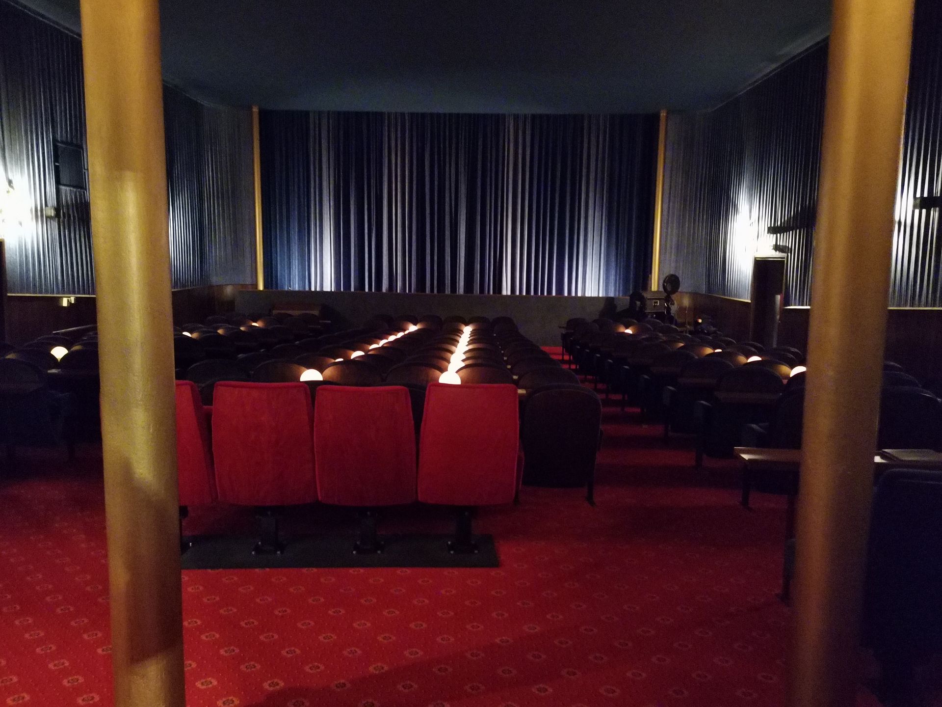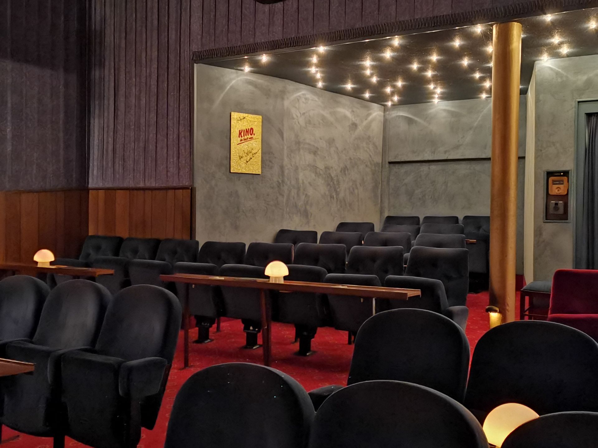 Die eleganten goldenen Säulen sind fest in das Gestaltungskonzept integriert und verleihen dem Kinosaal einen stilvollen, glamourösen Charakter.