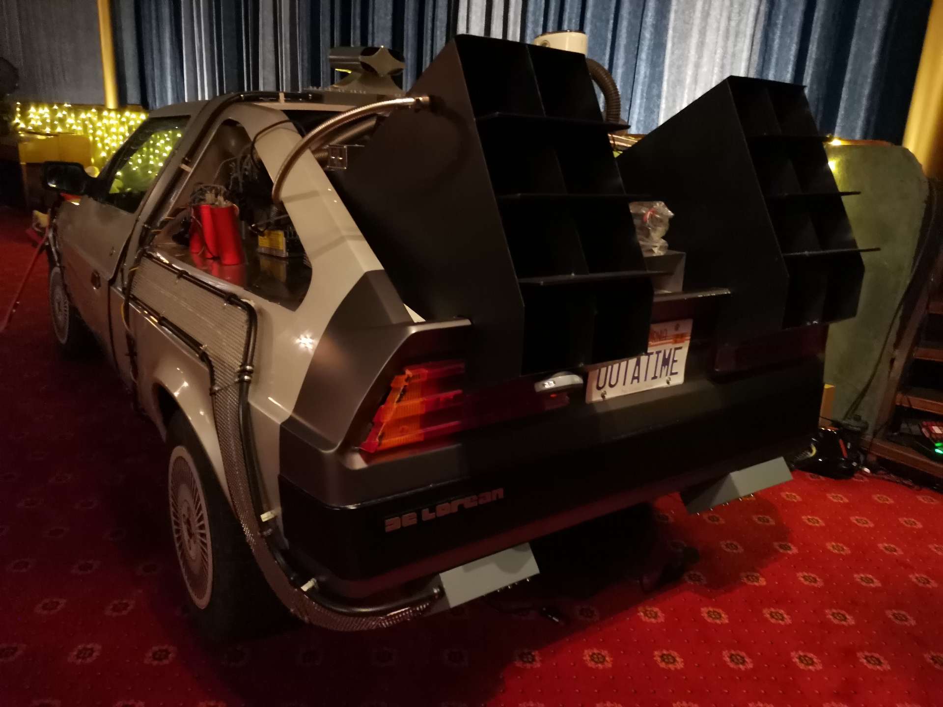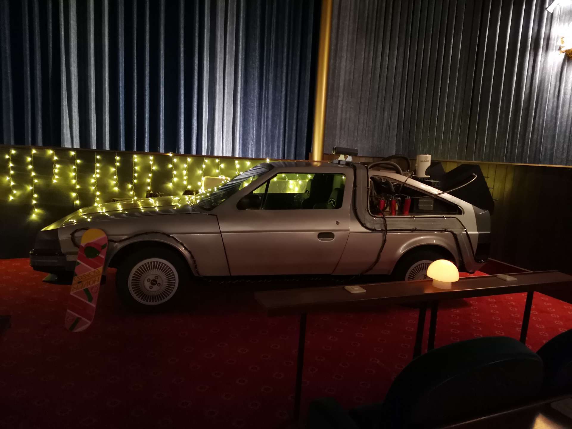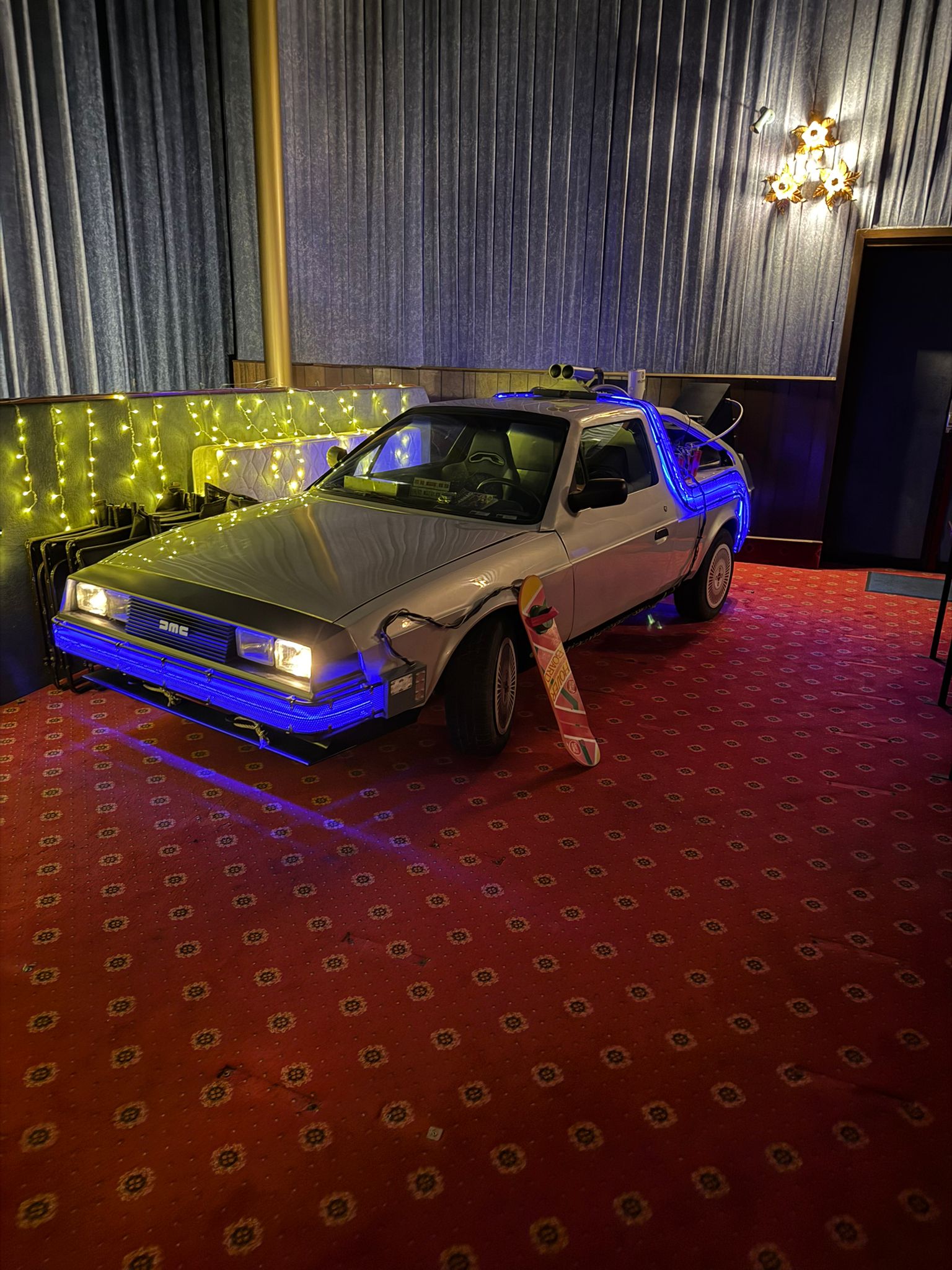 Entdecken Sie unseren detailgetreuen Nachbau der legendären DMC-12 Zeitmaschine aus „Zurück in die Zukunft“. Dieses Highlight ist ein absoluter Blickfang und das Symbol für unser einzigartiges Retro-Konzept.